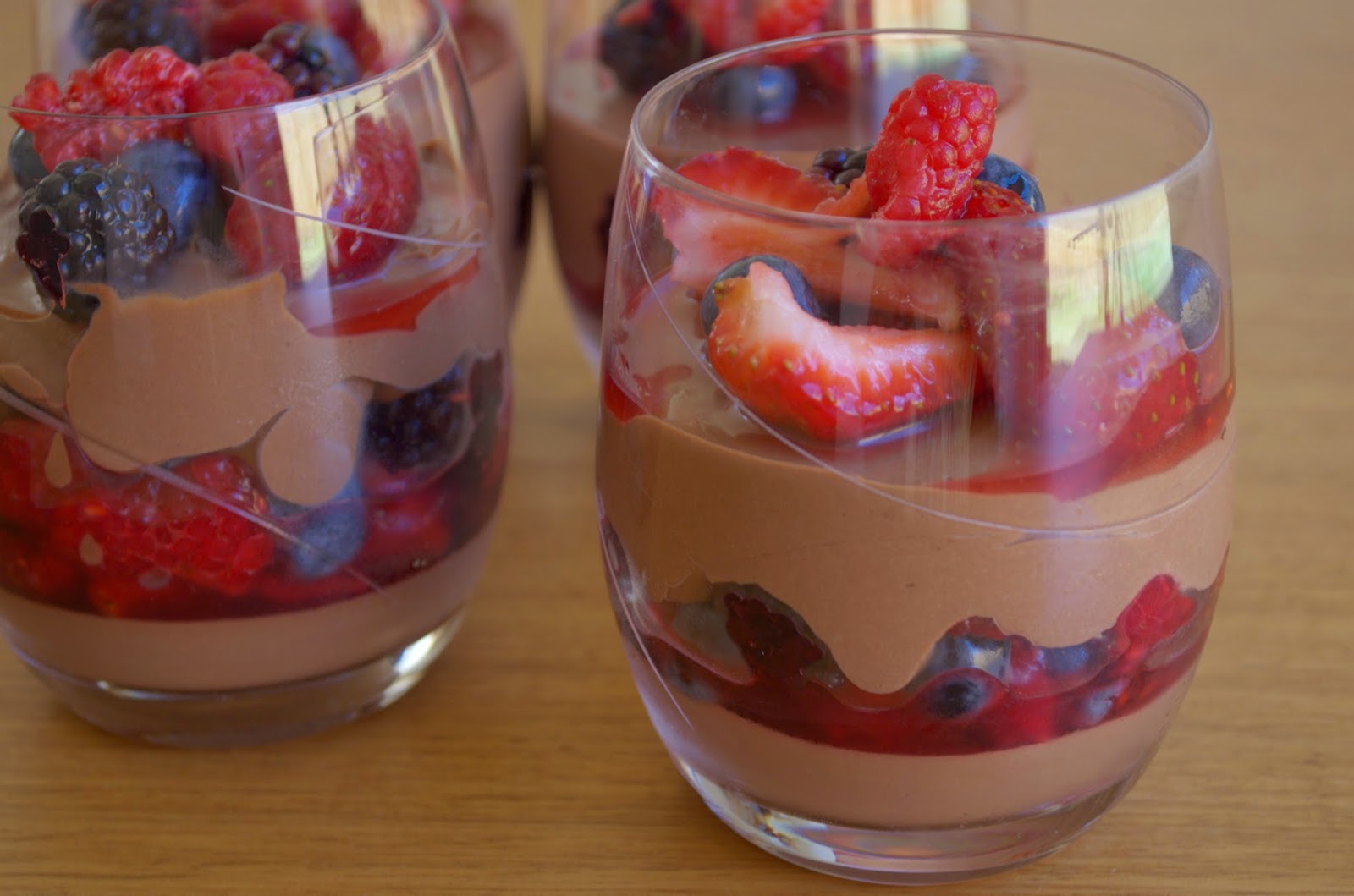 In a glass of choice (I used a tumbler, but a martini glass would work also), spoon a layer of mousse into the glass, add a layer of berries with some syrup, another layer of mousse, and another layer of berries.